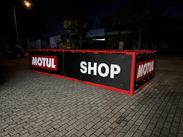 Zowel de belettering van de containers als het leveren en monteren van de borden en vlaggenmasten is door ons uitgevoerd op ons eigen terrein in Dokkum. Hierna is het geheel op transport gegaan naar Assen waar de pop-up store is ingezet tijdens de WK Superbikes en later de TT van Assen. De bedoeling is dat deze containers op het hele Europese continent meereizen met het MotoGP-circus. Een prachtig project waarin we samenwerkten met de ontwerpers van Motul en de leverancier van de containers, onze buurman Beldock.